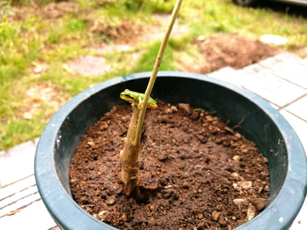 草抜きの間に唯一そこに小さな木を発見した。なんの木かはわからない。かわいいので根っこから抜いて鉢植えに移そうとしたが、あまりにも根が太くてブチっと折ってしまった。育つかはわからないが一先ずプランターに植えてみた。ふと見ると私の最も好きな生き物であるアマガエルが小さな切り株の上でくつろいでいるではないか。天気が良ければ何時間でも見ていられそうだ。
