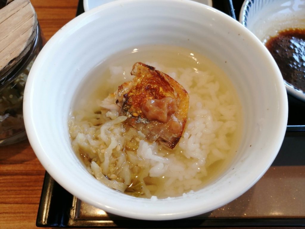 またその隣には茶漬け用のダシが用意されている。残しておいたサバの半分に梅肉を少し乗せ、卓上にある漬物を少々乗せたところにダシを注ぐ。ダシにサバの脂と旨味が溶け込んでどんどん食べてしまう。このあと図々しくも3杯もおかわりしてしまった。