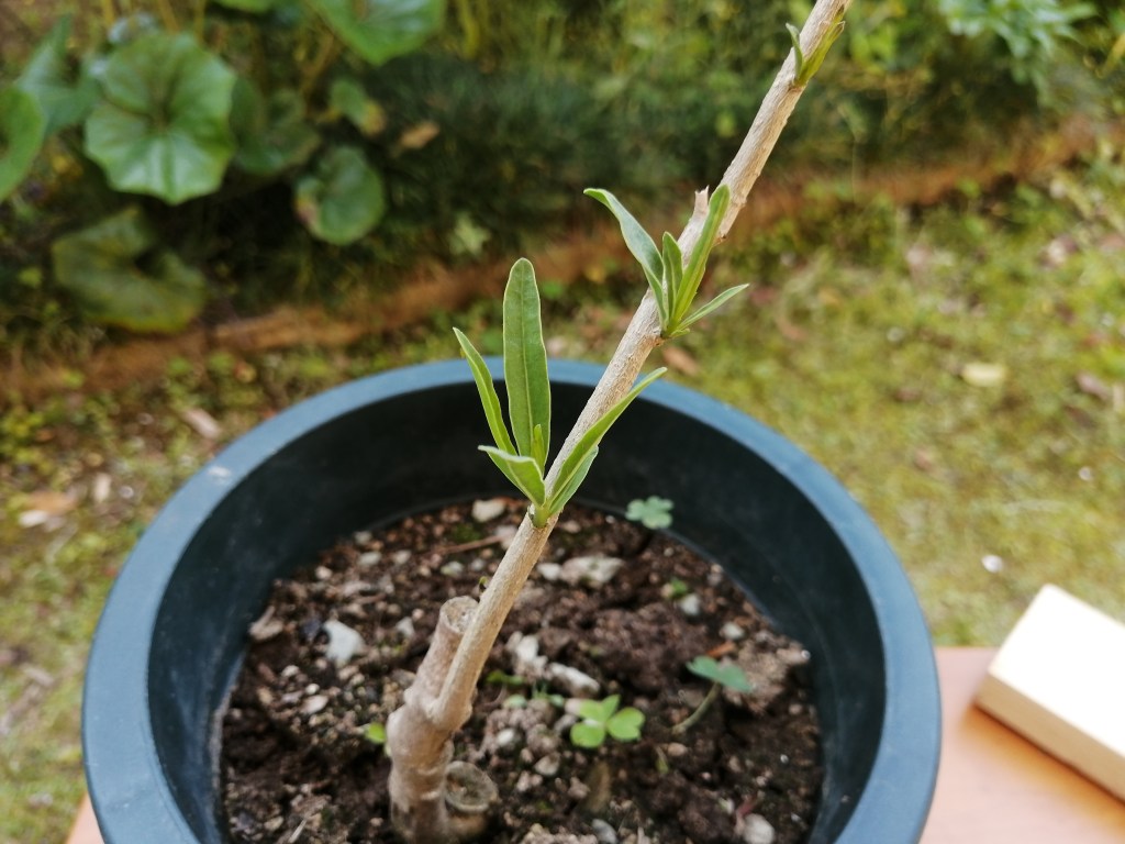 あれから引越しのバタバタの中で、なんとなくトラックに放り込んで持ってきたものの、真冬の寒さの中でどう見ても枯れ果ているので、処分しなくてはと思いつつ、改装に夢中でそのままになっていた。春になって庭の草が繁茂していたので草抜きをしていると、ふと鉢植えの枯木に目をやると、芽吹いていた。