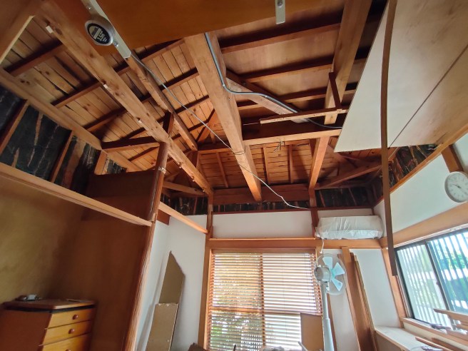 今月頭から着工した教室スペースの改装。内容は可もなく不可もなく2週間が過ぎ去った。強いて「可」を言うならば、この1年半の間慢性的なストレスだったペラッペラの天井、押し入れスペース&床の間を全て破壊し去って「思い描いていた」空間が眼前に現れたこと。頑丈な天井があったならまだしも、設置したダクトレールが落っこちてきてしまうほどビスが効かない天井はご覧のように無くなり、開放的な屋根裏が現れた。