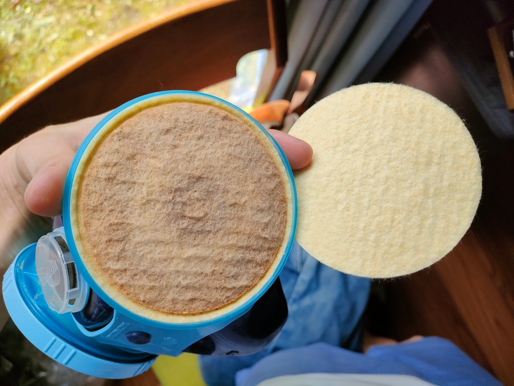 ご覧の通り、ゾッとするほどの汚れ。凝視してみると丸ノコを使った時などの、割合大きめの木粉塵が見て取れる。屋根裏に潜んでいたグレー色の汚れはダニの死骸や糞など、風が起きなくとも煙のように空気中に漂うのはそれが如何に細かい粒子かということが分かる。こんなものを吸引していたとは、炎症が起きて当然中の当然である。ポジティブに捉えればこれからはマスクのおかげで健康的に作業は行える。グラインダーなどで木材を研磨する際は、更に密閉ゴーグルに耳栓も用いる。さらに工業扇で換気もする。